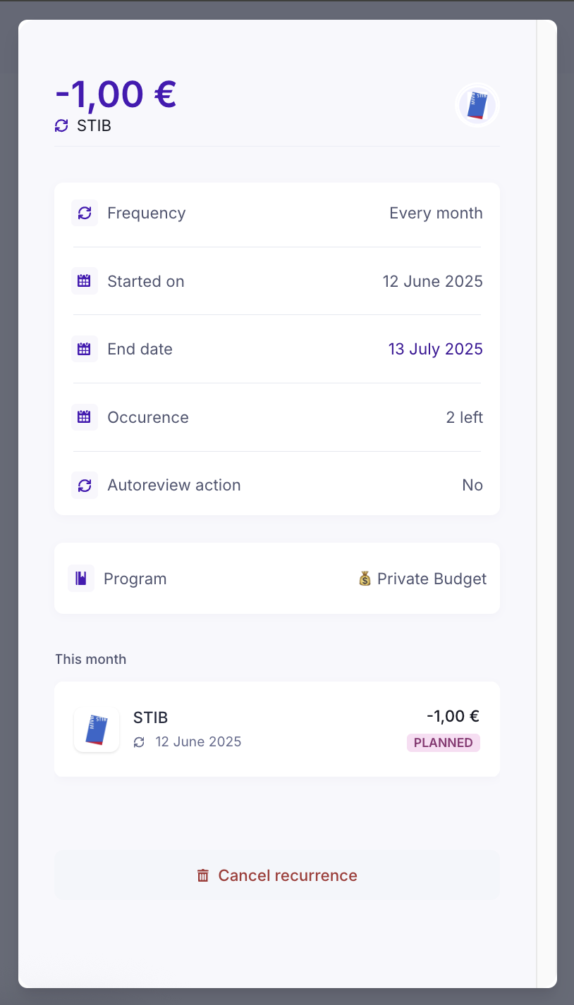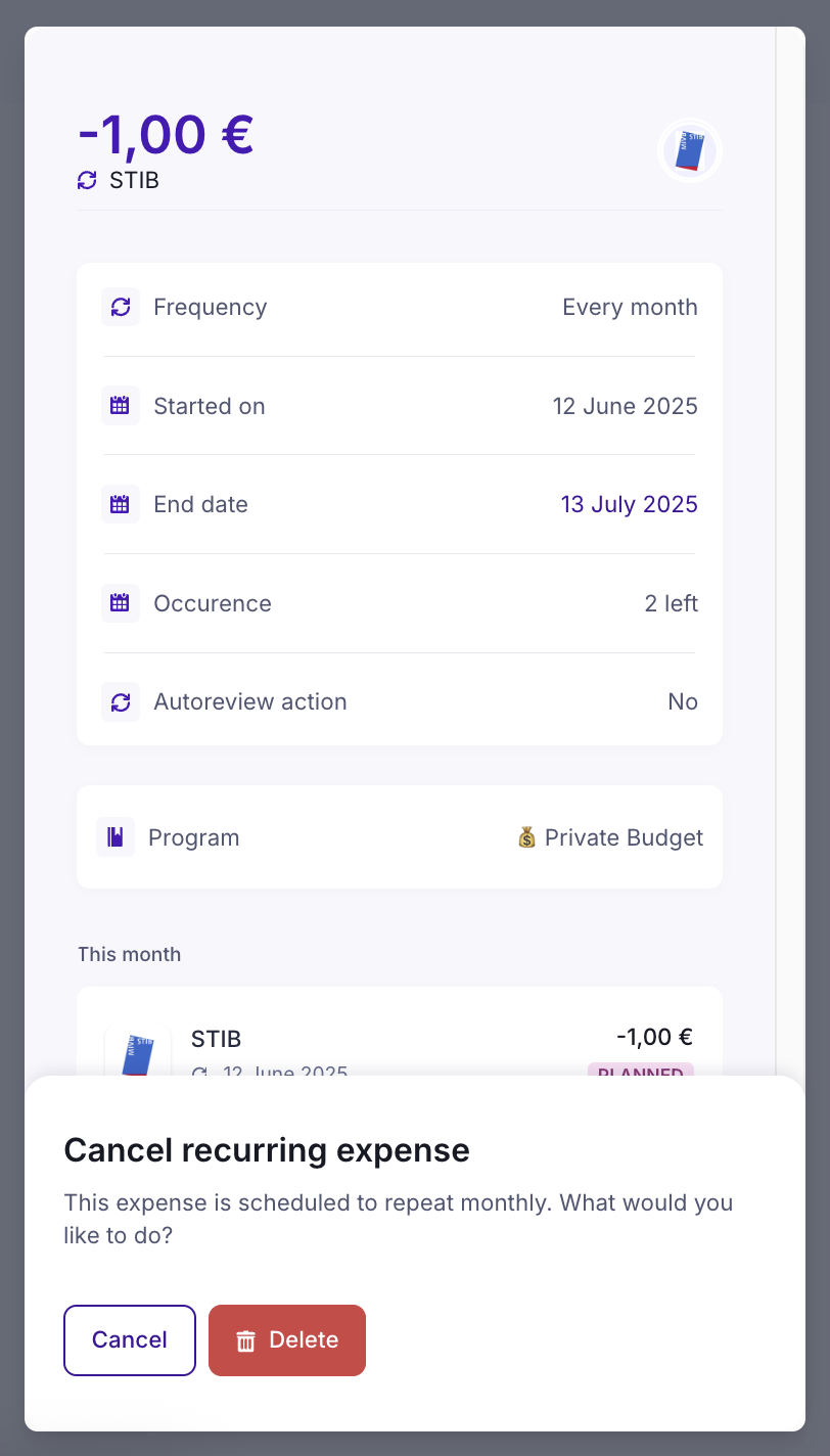 • To delete the recurrence, click on "Cancel recurrence". All future expenses will be deleted, and no future expenses will be created.