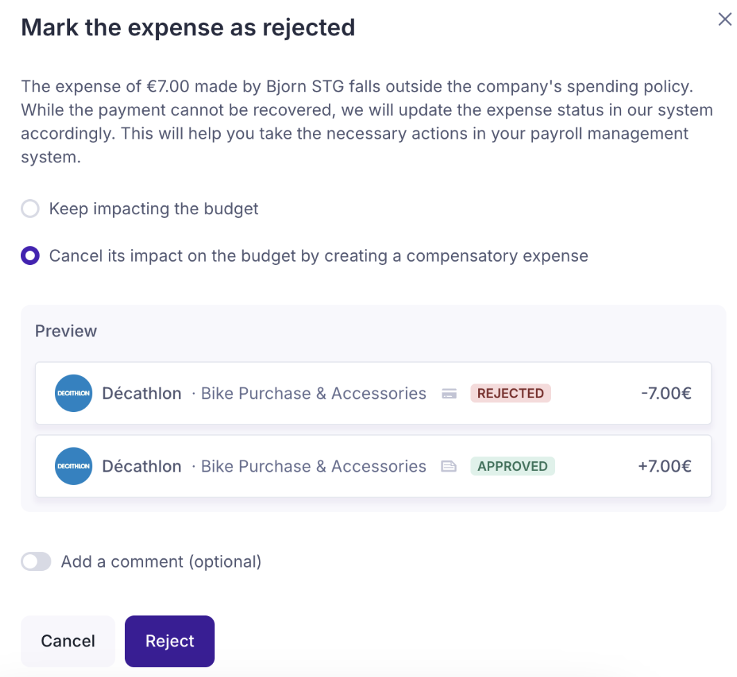 For example: an employee spent €7 at Décathlon. After verification of the receipt, it appears that the expense was made for swimwear, thus being out of policy. The admin decides to reject the card expense and chooses option 2. The employee will have a compensatory expense of €7 created in his/her budget, which sets the budget back to what it was before the expense was made, and the admin will then make a payroll deduction of €7, as the expense made was not compliant.