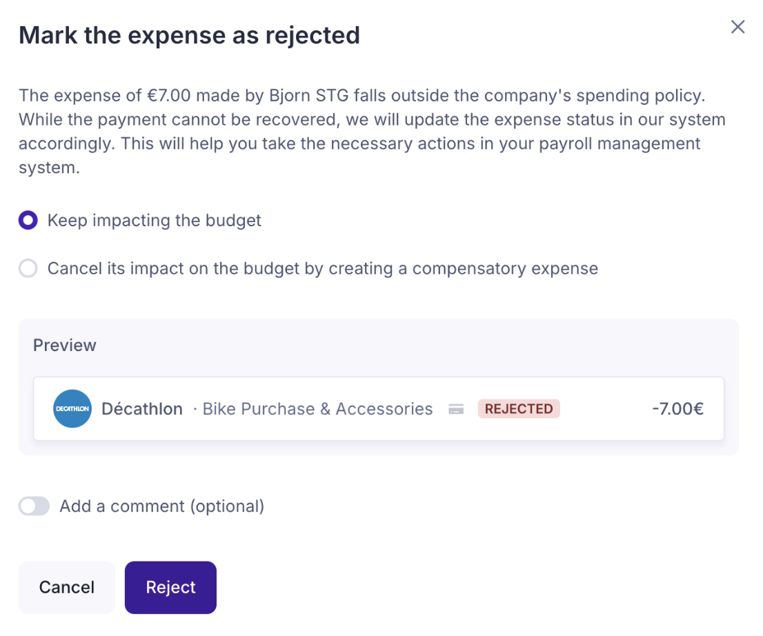 For example: an employee spent €7 at Décathlon. After verification of the receipt, it appears that the expense was made for swimwear, thus being out of policy. The admin decides to reject the card expense and chooses option 1. The employee will lose €7 in his/her budget, and the admin will then make a payroll deduction of €7, as the expense made was not compliant.