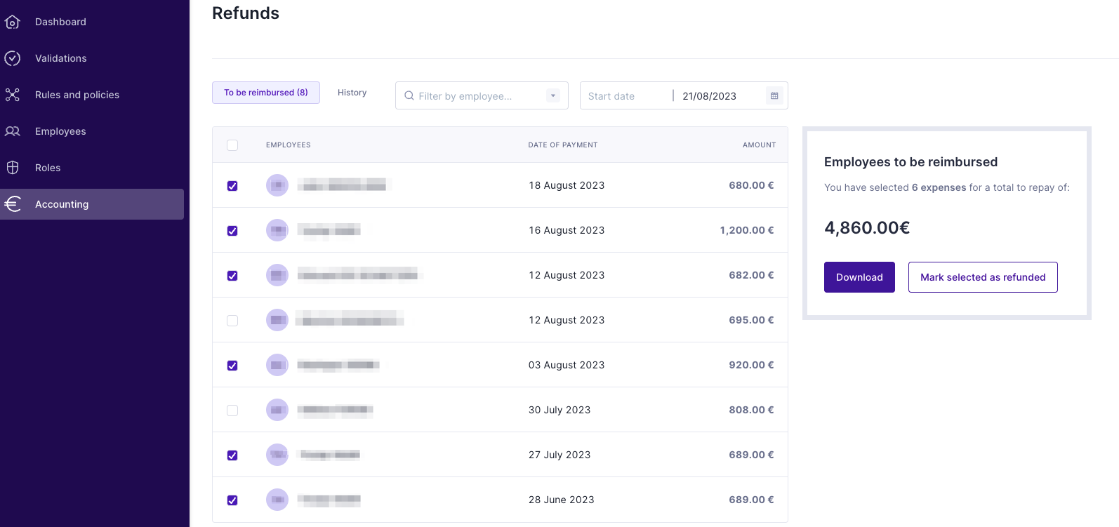 - The number and total amount of expenses to be reimbursed will be displayed in the right-side overview. Right below the total amount, you have two buttons to download the list (.csv format) and to mark the requests as reimbursed.