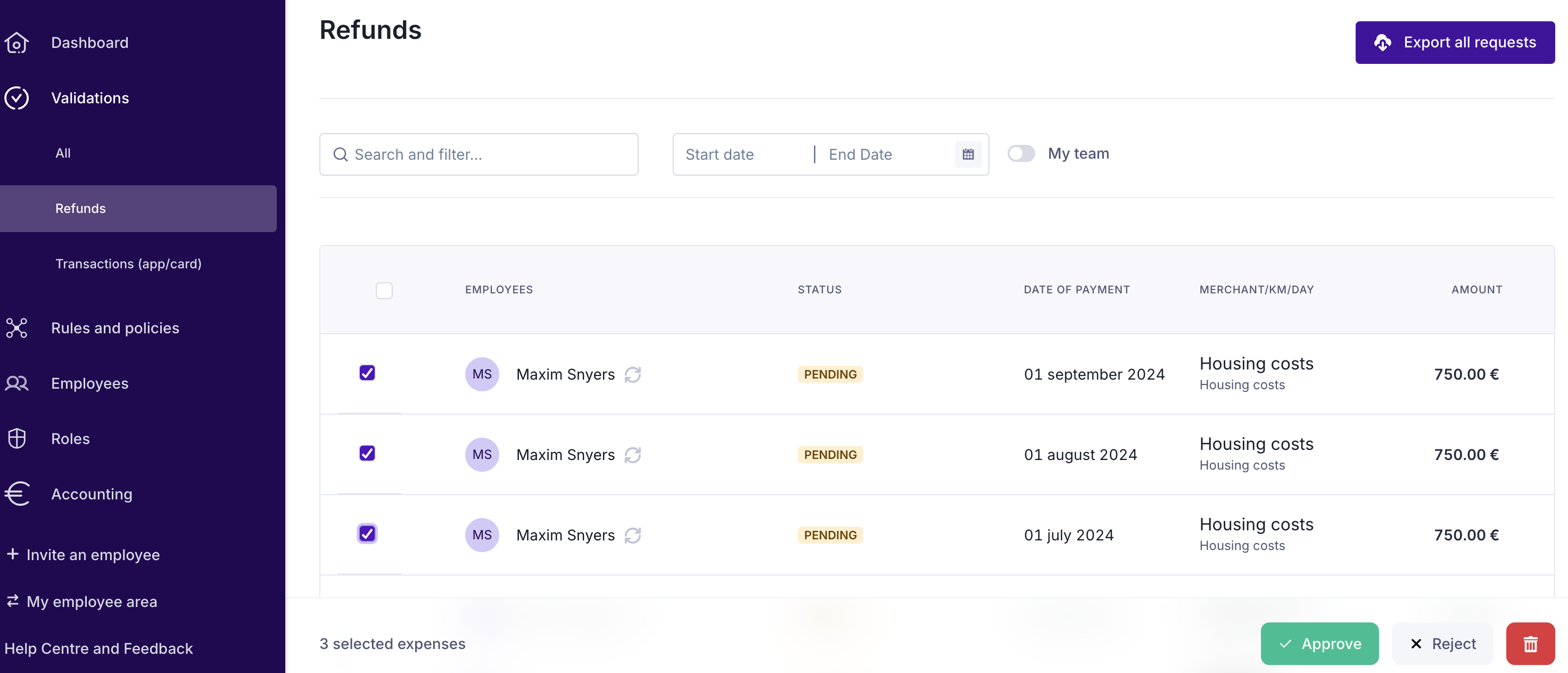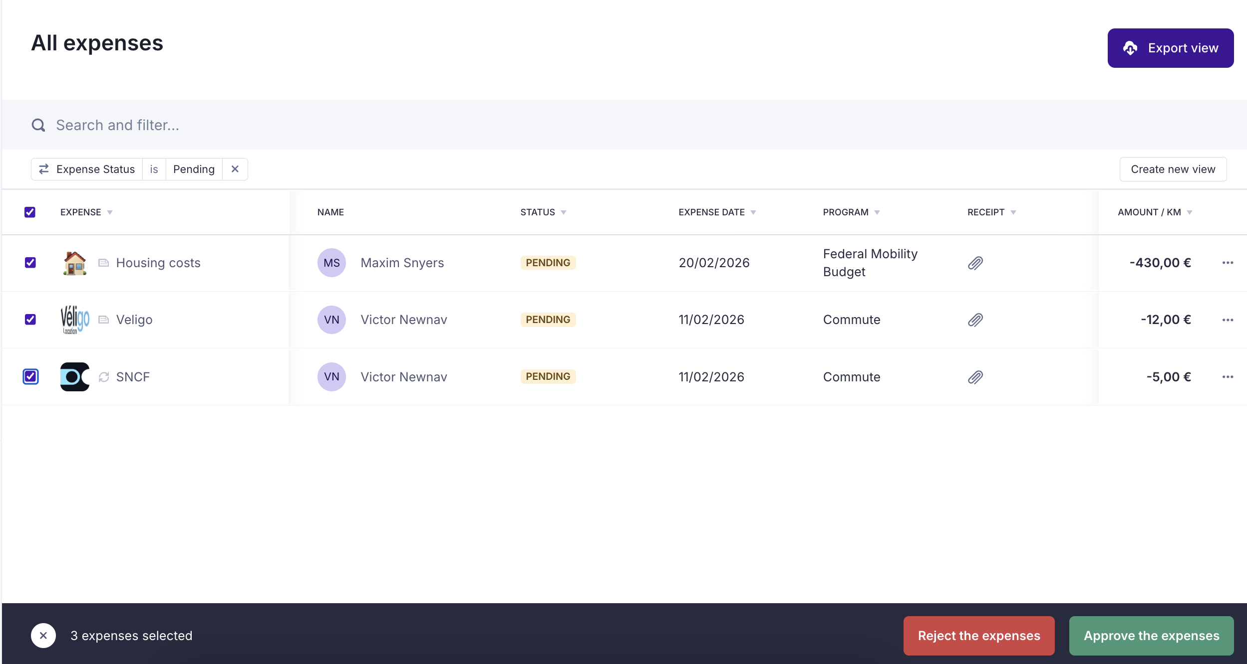 - Select the expenses you want to validate