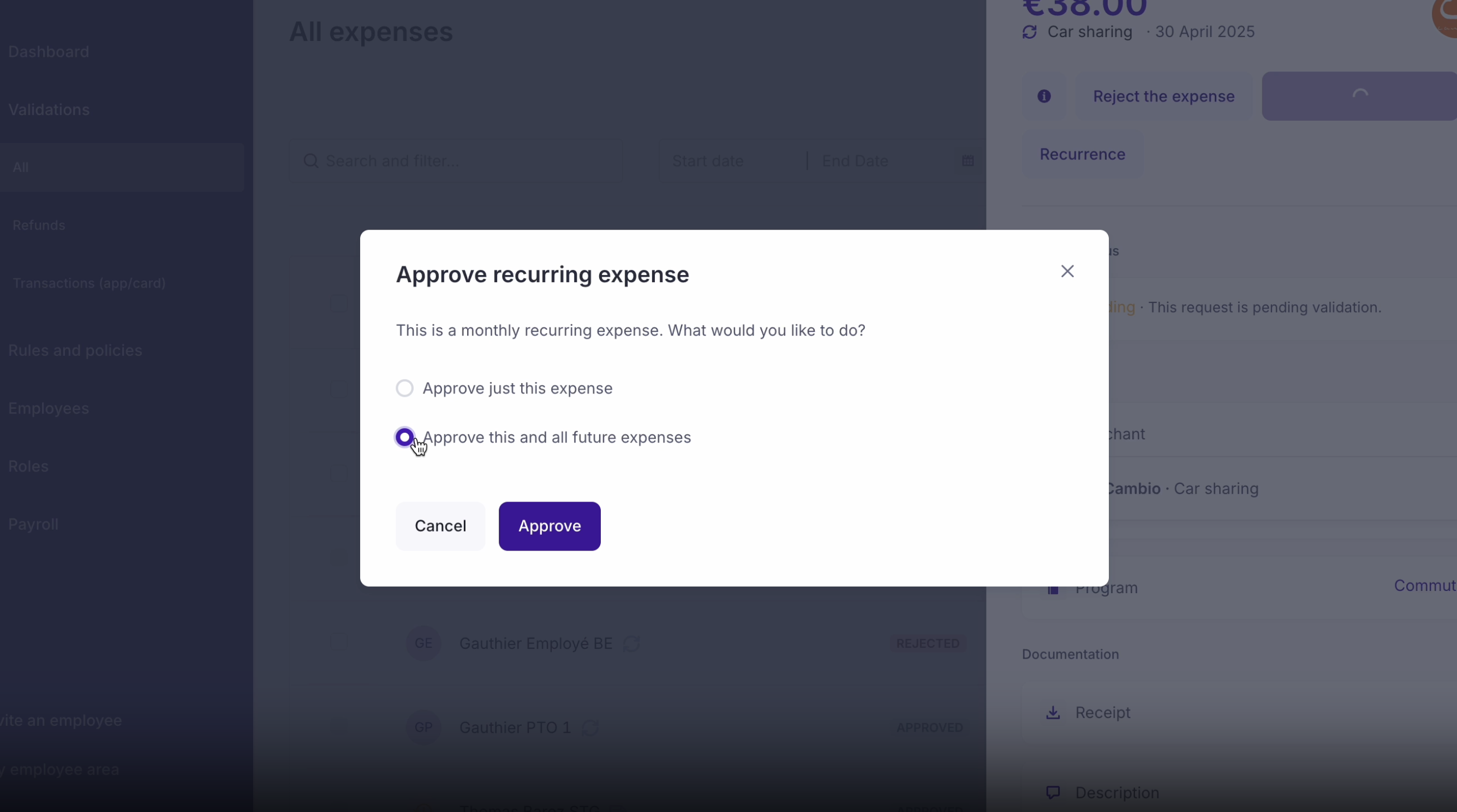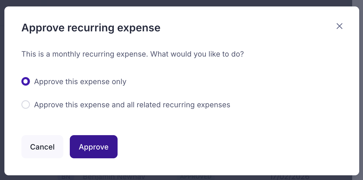 - Select "approve just this expense" if you want to only approve the current one, or select "approve this and all future expenses" if you want to approve all of them at once.