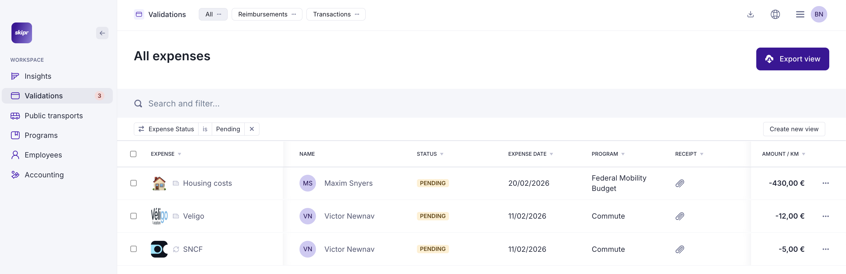 To view the list of expenses, click on "Validations". There are 3 separate views: