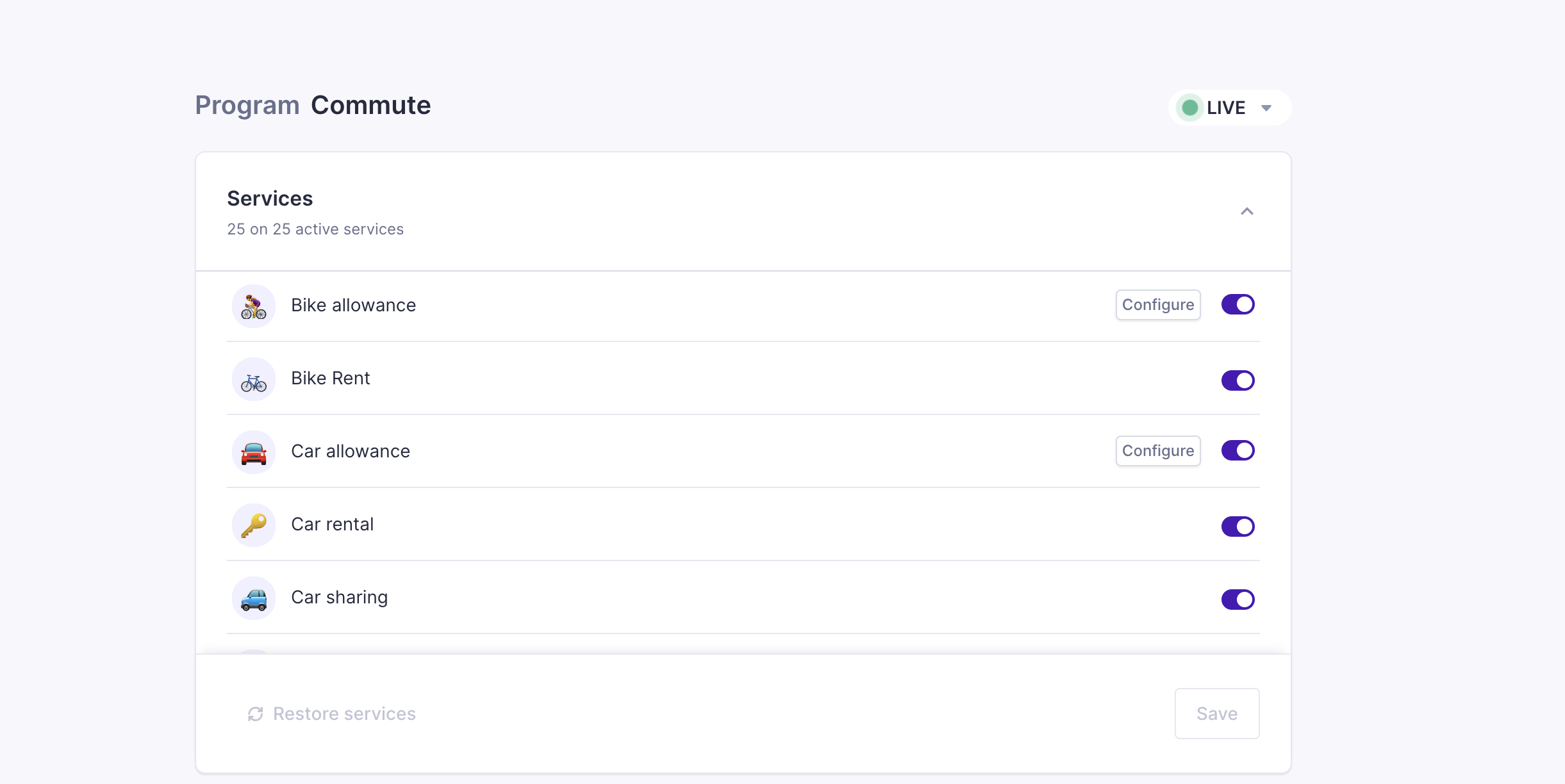 • You will have the list of services linked to this specific template. You can toggle on the services you want to include in the mobility program and some of them can be customised.