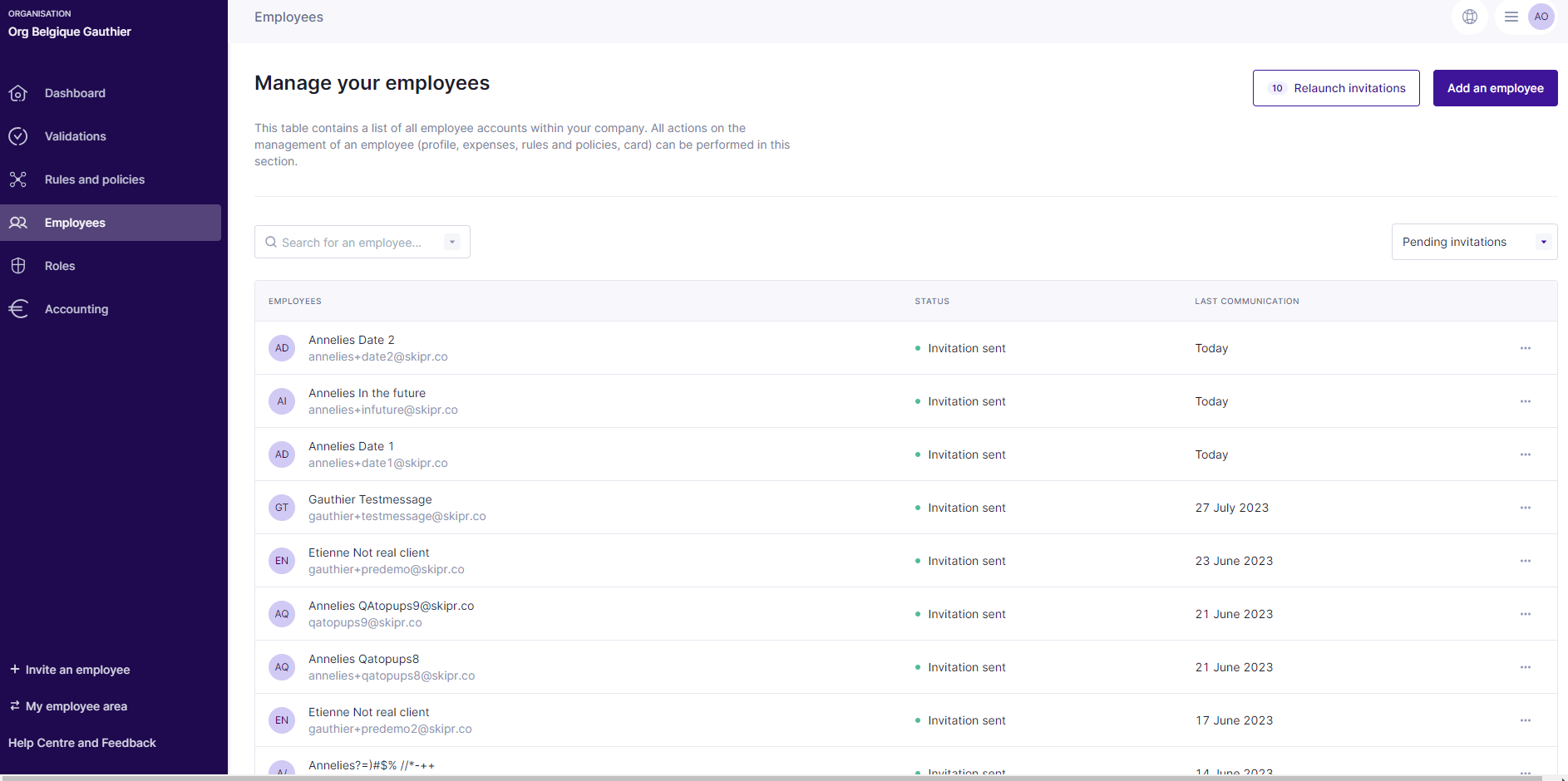 The list of invited employees is available in the "Pending Invitations" view of the Employees section.