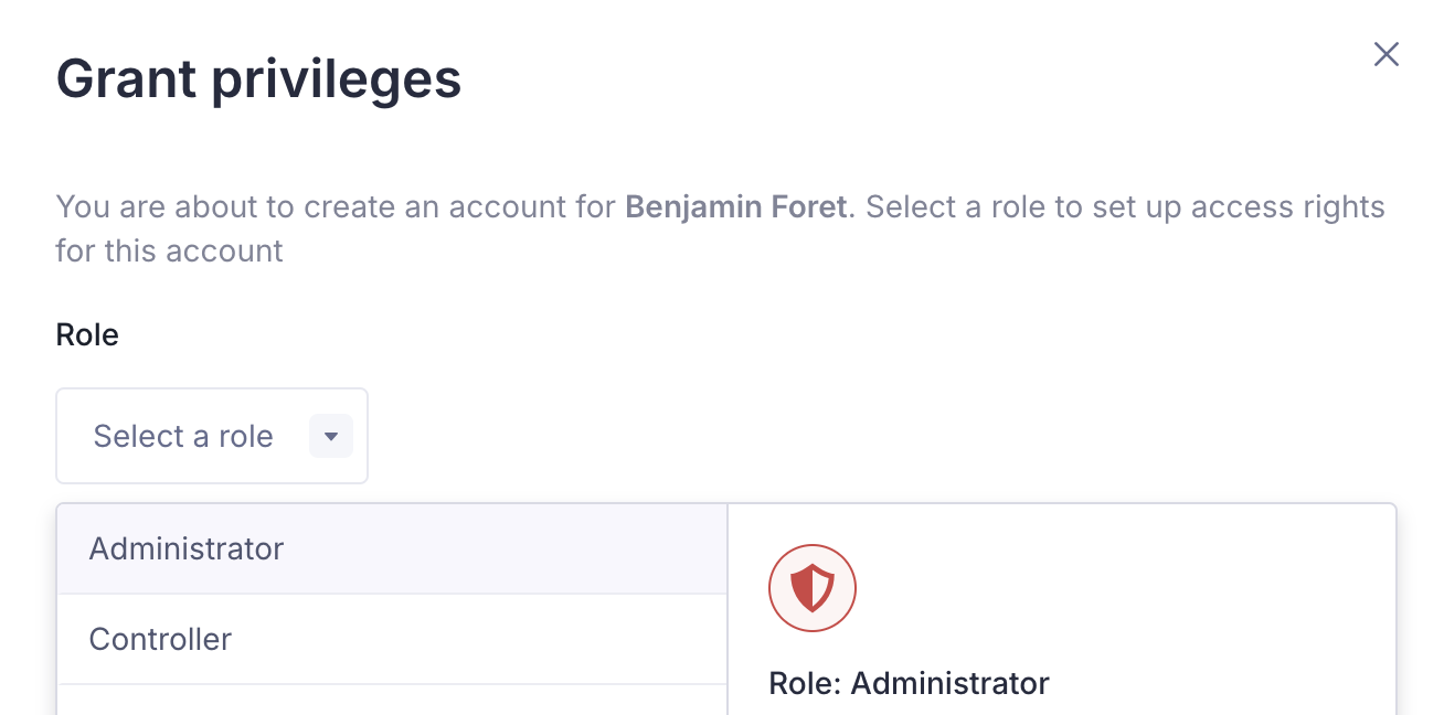 - Choisissez si vous souhaitez attribuer des droits d'Admin ou de Contrôleur