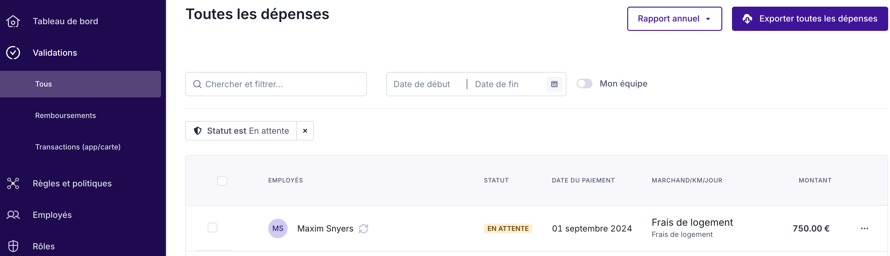 Dans la barre de recherche et de filtre, vous pouvez facilement filtrer par statut d'approbation "En attente". De cette façon, vous verrez uniquement les dépenses qui attendent une validation d'un administrateur. Vous pouvez également ajouter d'autres filtres si vous recherchez des dépenses spécifiques.