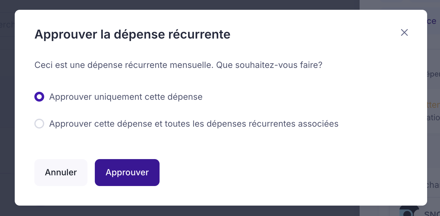 - Sélectionnez "approuver cette dépense" si vous voulez en approuver qu'une seule ou sélectionnez "approuver cette dépense et les dépenses futures" si vous désirez approuver toutes les récurrences futures en plus de celle sélectionnée.