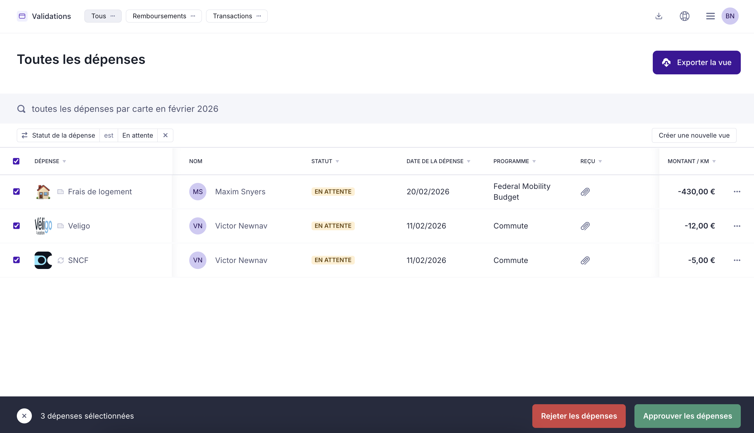 - Sélectionnez les dépenses que vous souhaitez valider.