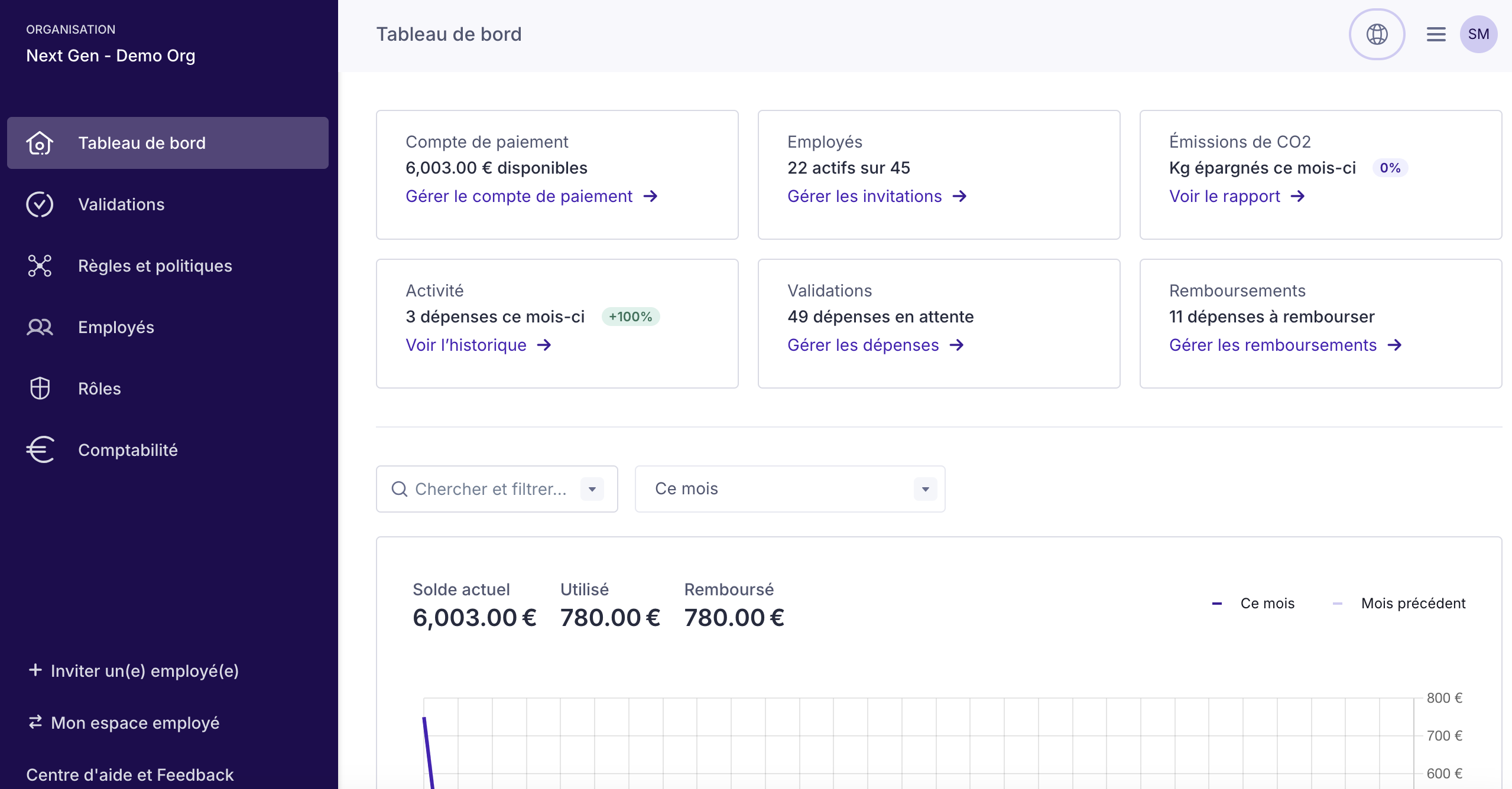 Le rôle Contrôleur est réservé à la validation des dépenses (paiements par carte et demandes de remboursement). Son accès est limité au menu Validations.
