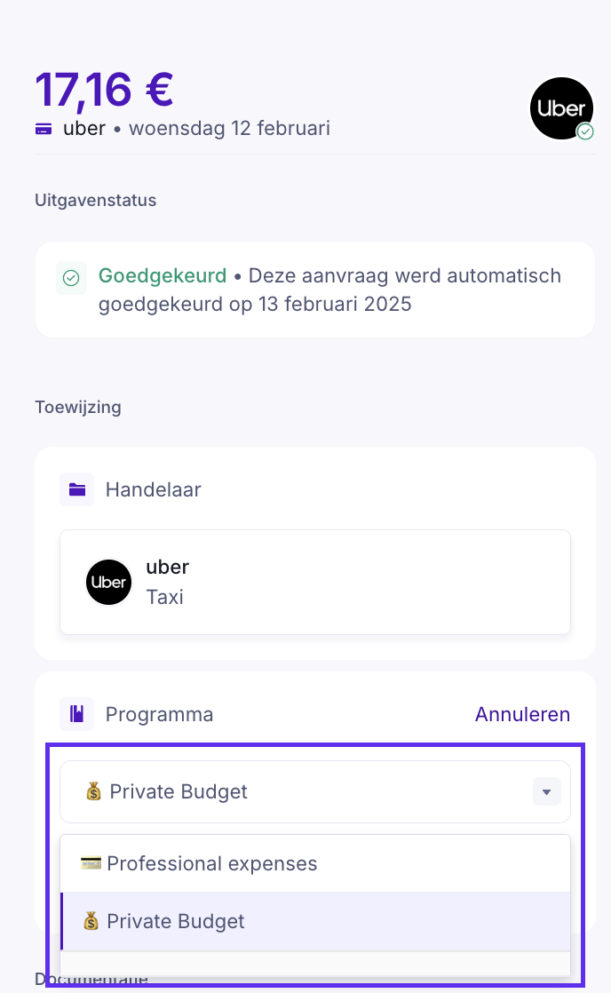 Klik op de betreffende uitgave of terugbetalingsverzoek in je uitgaven-/verzoekgeschiedenis: