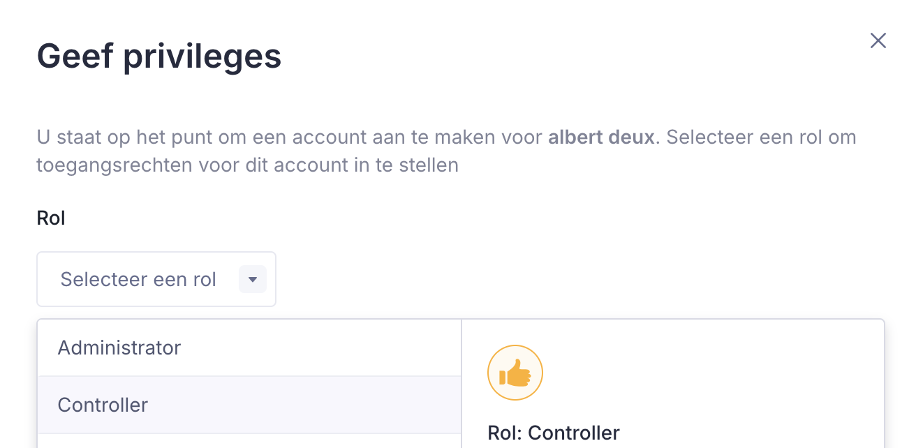 - Kies of je Admin- of Controller-rechten wilt toekennen