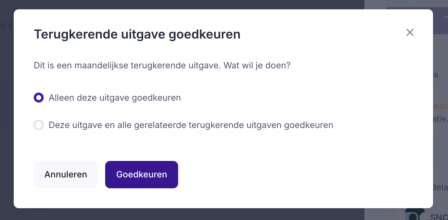 - Selecteer "alleen deze uitgave goedkeuren" als je alleen de huidige wilt goedkeuren, of kies "deze uitgave en alle gerelateerde terugkerende uitgaven goedkeuren" als je ze allemaal in één keer wilt goedkeuren.