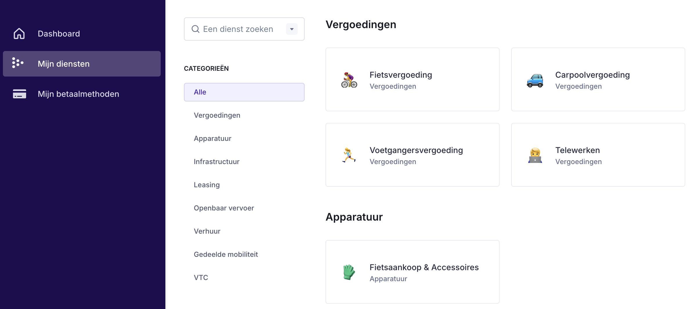 De mobiliteitsdiensten waartoe je toegang hebt, worden bepaald door het mobiliteitsbeleid van je bedrijf. Om te zien welke diensten zijn toegestaan, ga je naar je dashboard of je mobiele app en klik je op “Mijn diensten”.